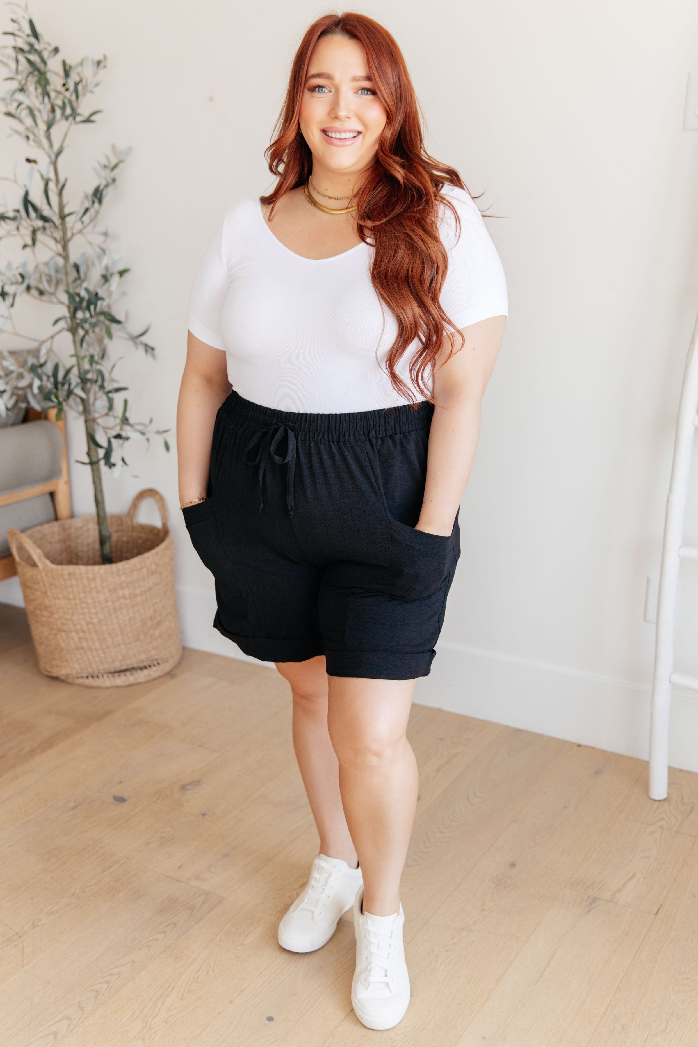 The music's loud, so dance through life with style in The Way I Use My Walk Drawstring Shorts! Featuring a comfortable elastic band, functional drawstring, and large front pockets perfect for everyday essentials. The oversized leg adds a trendy touch, and the woven knit blouse provides the perfect balance of comfort and style.
